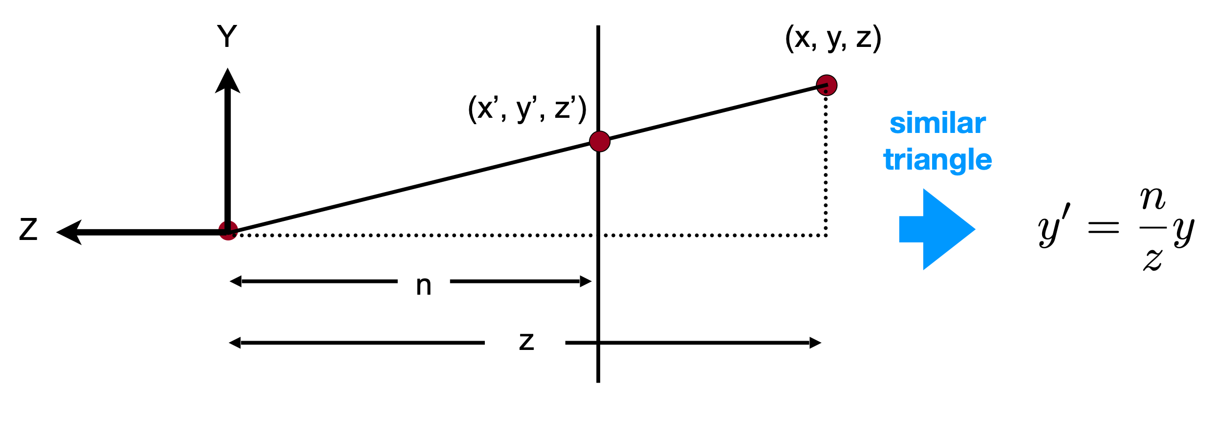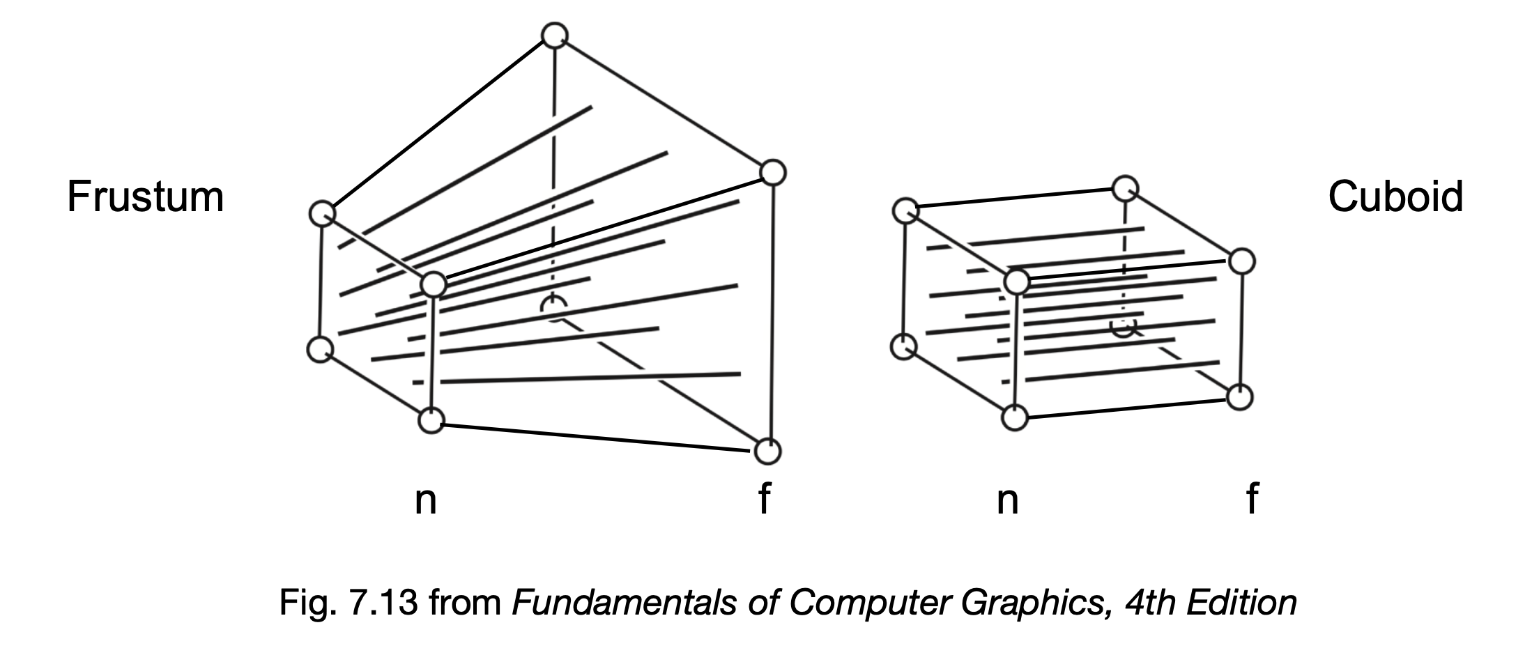 \[Mpersp->ortho = \left [ \begin{matrix} n & 0 & 0 & 0\\ 0 & n & 0 & 0 \\ 0 & 0 & n+f & -nf \\ 0 & 0 & 1 & 0 \end{matrix} \right ]\] \[Mpersp = Mortho Mpersp->ortho\]